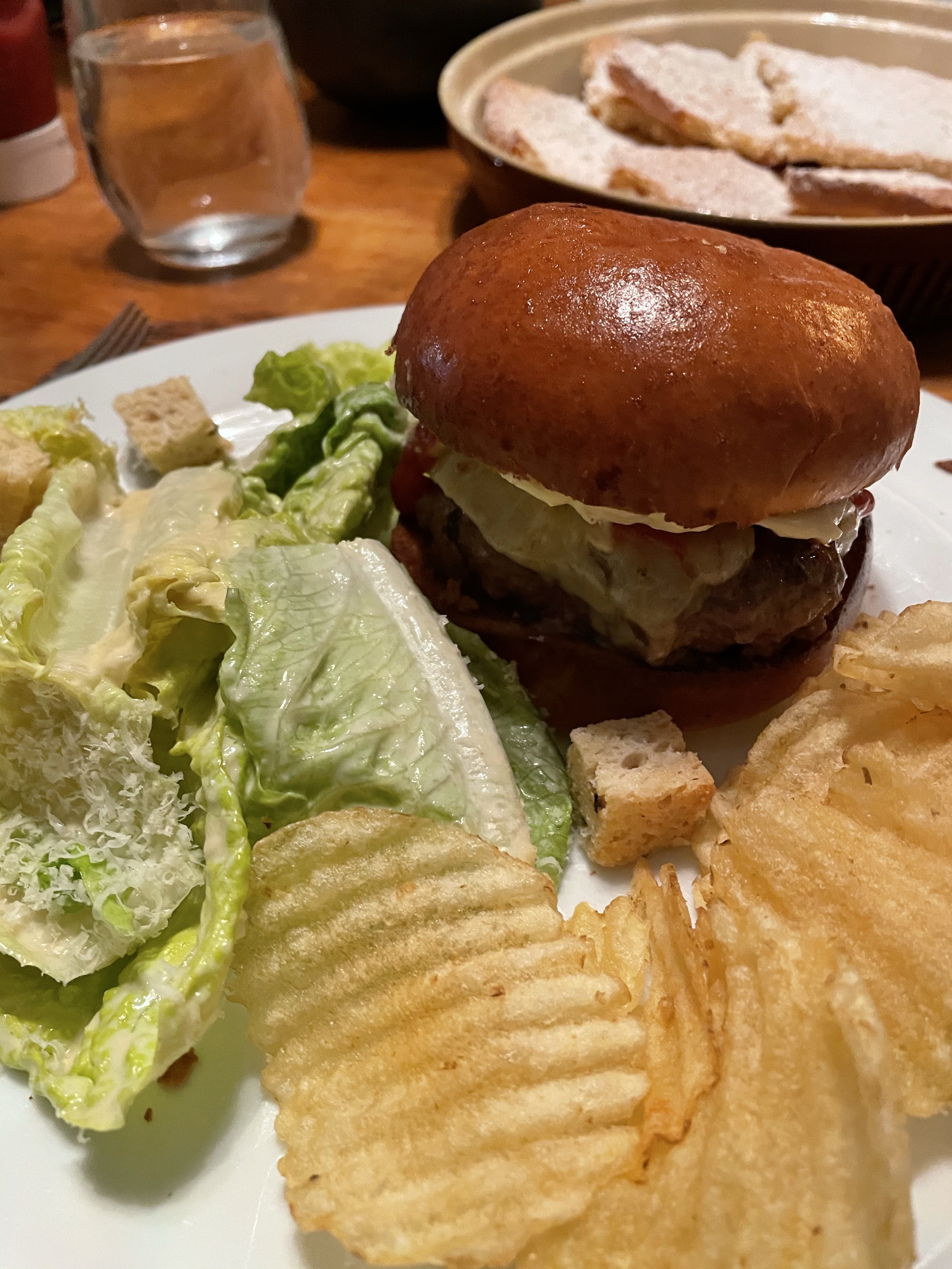 This week’s cookbook on the cookbook shelves journey was The Family Meal by Ferran Adria – this is a collection of recipes that they used at the very famous restaurant elBulli in Spain. But these are the recipes that the staff ate for what they called the “family meal,” which was the meal all 75 members of the team sat down to before the evening service. What we liked about this book was that all the meals are set out for three courses, and the food is straightforward – quite a departure from the cuisine at elBulli. This week we had two menus of starter, main, and dessert. Menu 1 was Ceasar salad, cheeseburger and potato crisps, and Santiago cake and menu 2 was melon with cured ham, rice with duck, and chocolate cake. This week’s outstanding dishes were the Ceasar salad and burger and the rice with duck which was, without doubt, the recipe of the week. Next week we have a slightly tricky book of just vegetables….
