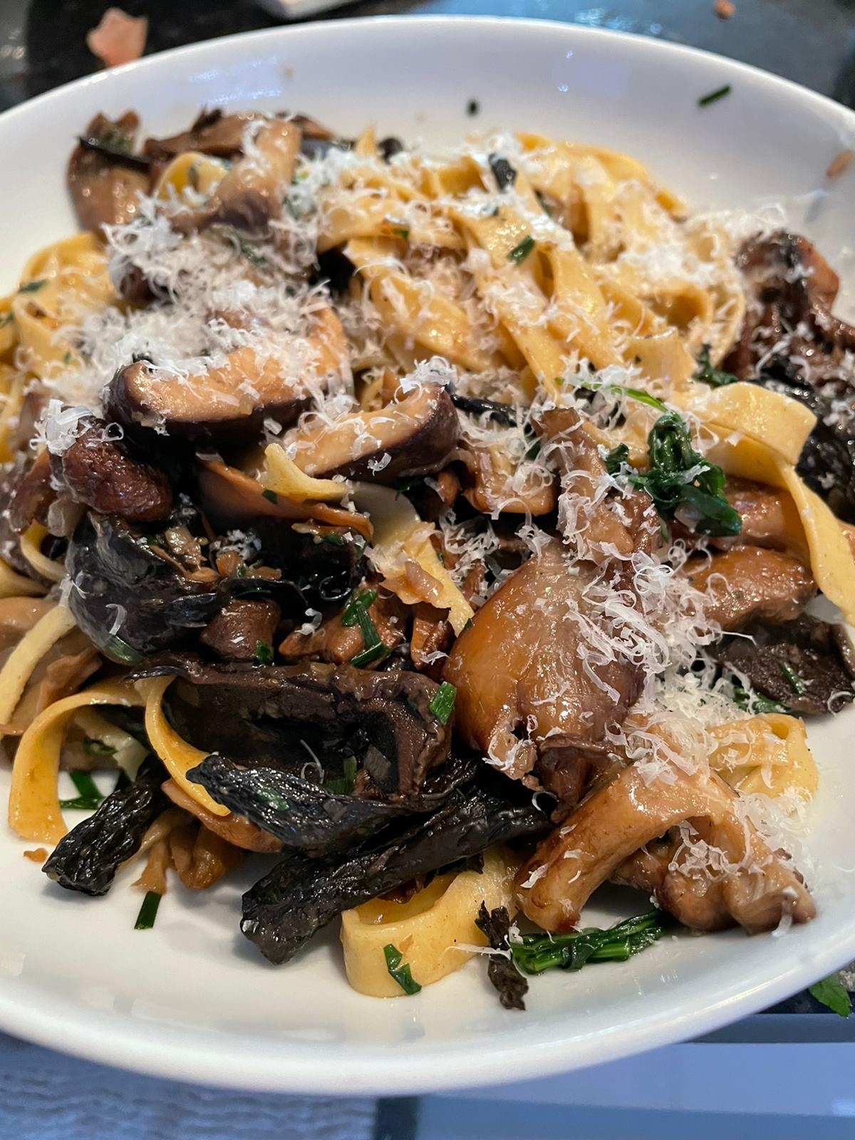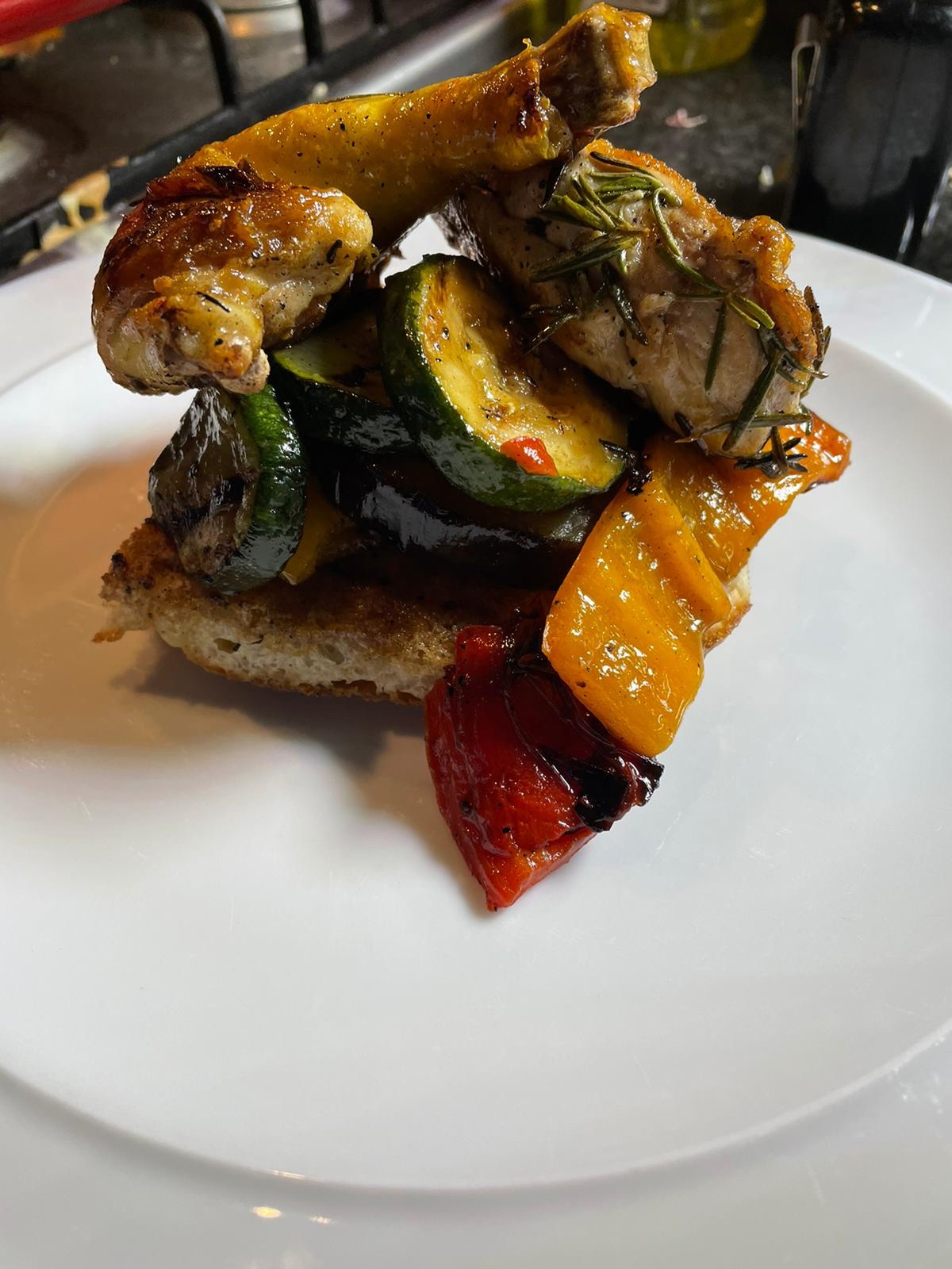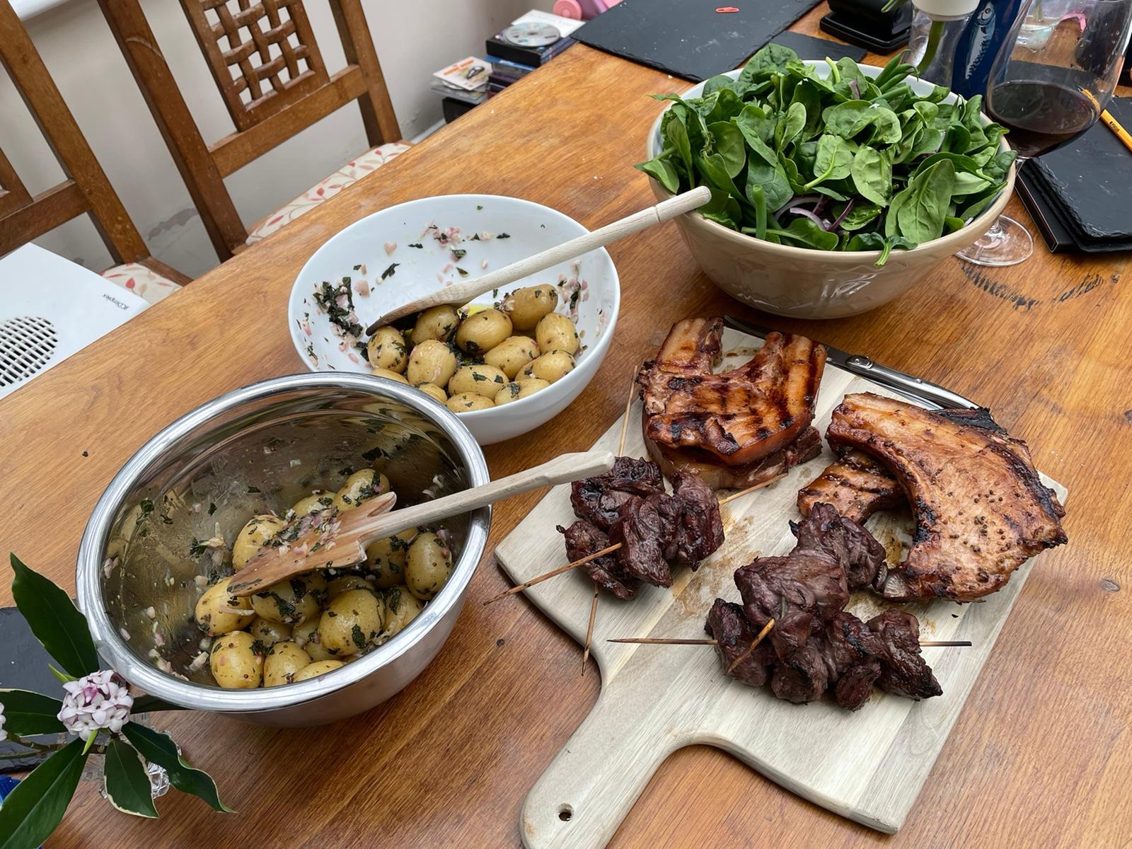 This week’s book is Gordon Ramsay’s Sunday Lunch cookbook. This is a lovely book of Sunday lunches (3-course menus with a theme). Finding three courses from the same menu that the whole crew would eat was a challenge, but we landed on the bbq lunch! We started with crushed peas on toast with mozzarella and pecorino – these little bruschettas were delicious. The main course was marinated lamb kebabs (marinated in ginger and port) with honey and mustard pork chops which we served with a spinach and green bean salad and a potato salad. Desert was a rather lovely blueberry and redcurrant Eton Mess. The three courses were delicious indeed. The star being the starter! Across the week, we did a few other recipes from the book: Chicken Marsala with red chicory, Sausages with lentils, tagliatelle of wild mushrooms, griddled spring chicken, and vegetables on focaccia, followed by Iced berries and white chocolate sauce. The chicken Marsala has to be one of the most straightforward and most tasty dishes we’ve cooked of late – just exceptional flavours from some very simple ingredients. Sausages with lentils again was a super supper dish. We loved the spring chicken dish for which we made our focaccia—all in all, a pretty good week from Mr. Ramsey. The Sunday lunch itself was perhaps not the strongest of the dishes, but in the Marsala chicken, we found a dish that I think will be a family staple. Next week we’re cooking from a book that was brought to us from “Middle Earth”…