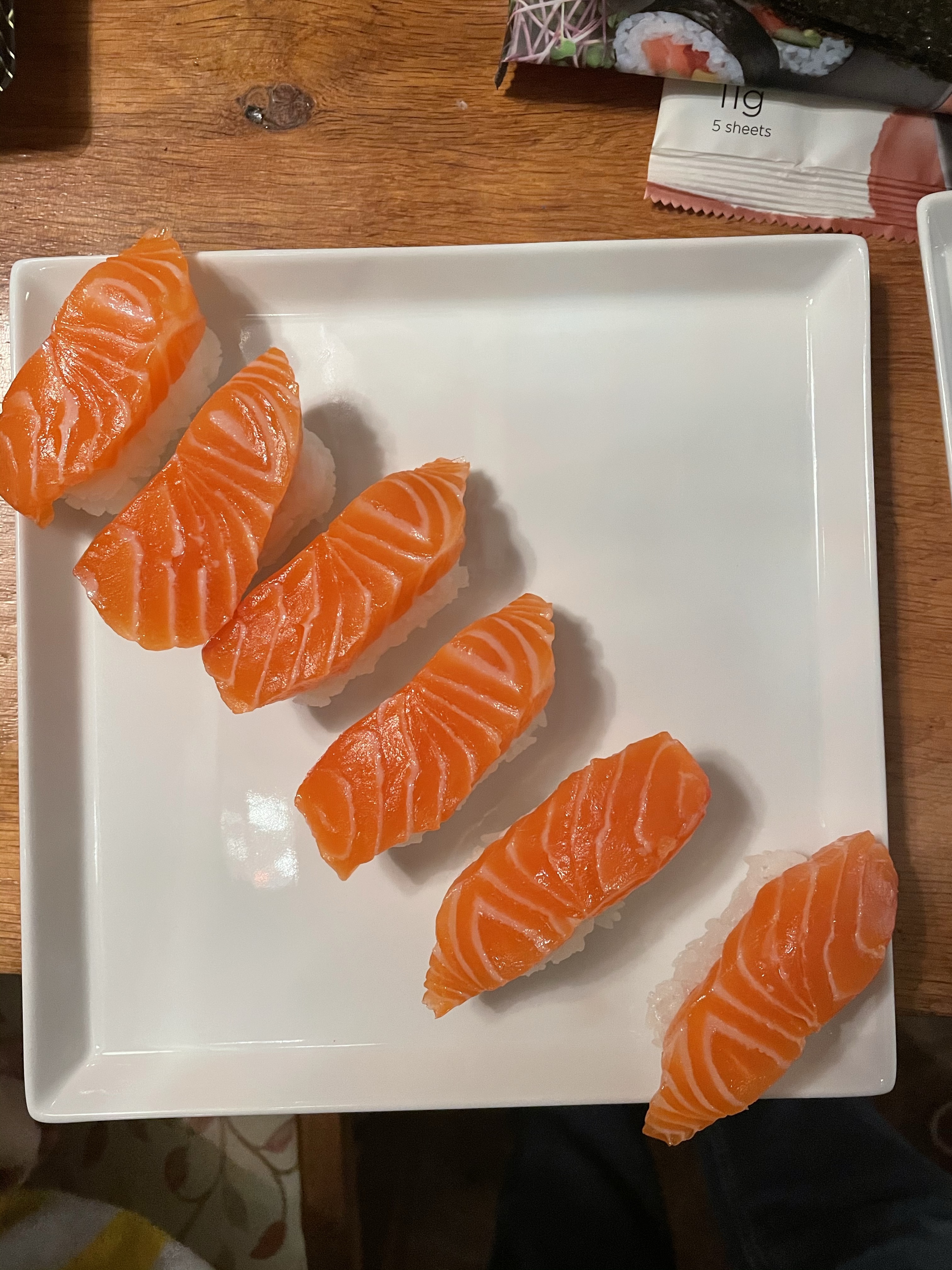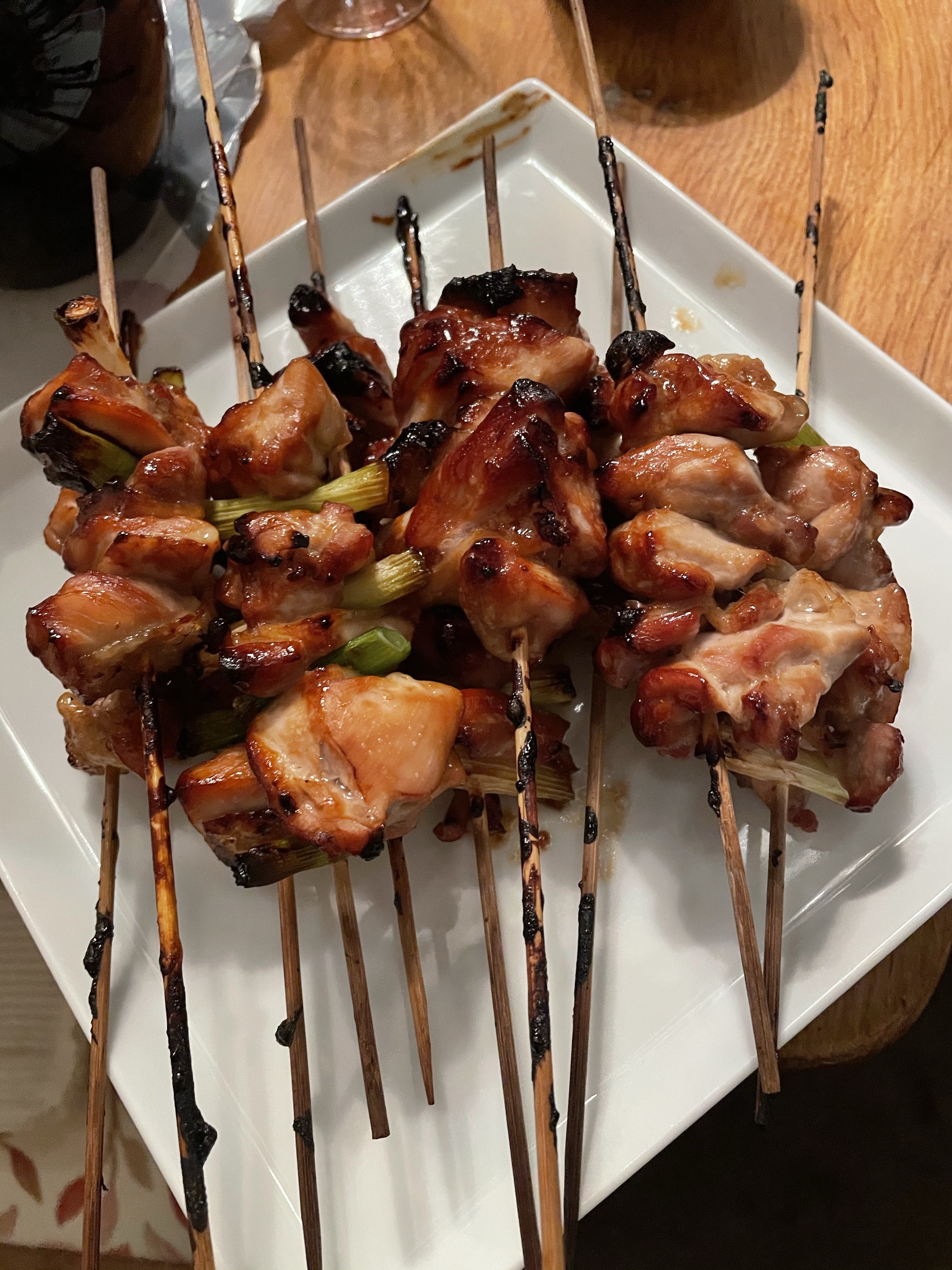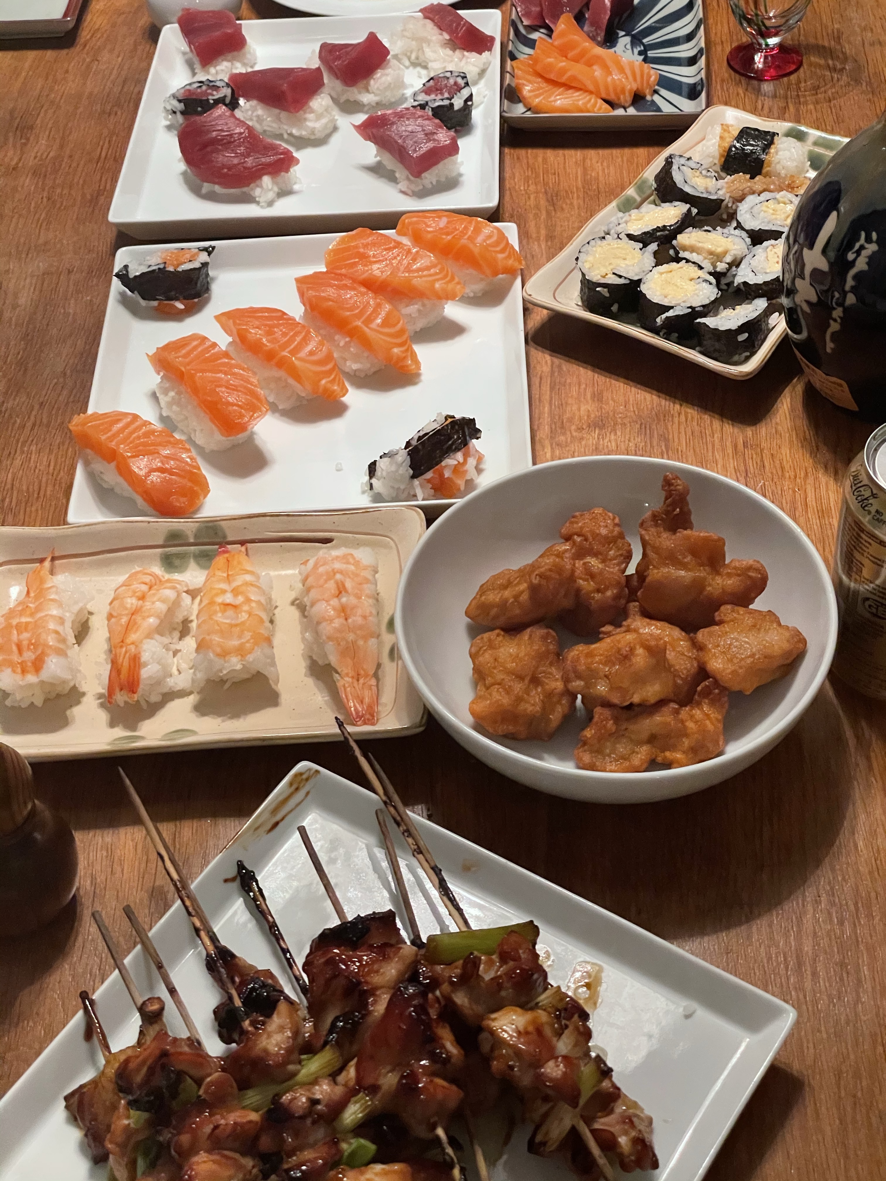 This week’s book was The Book of Sushi. This isn’t really a cookbook per se but more of a guide to sushi. The book talks about the history, the technique, the different types, different accompaniments and is a wonderful book that we’ve had for many years. There are, however, only two recipes in the book: sushi rice and sushi omelette (Tamagoyaki)- so we did both of those and augmented with recipes from Tim Anderson’s Japaneasy. The image you see before you shows our daughter’s Nigiri sushi (Salmon, Tuna and Prawns), Tamagoyaki Sushi, California rolls, Sashimi, Chicken and Spring Onion Yakitori, Karaage chicken, and Sweet soy and stout-braised pork belly. All washed down with a little Sake and Asahi Beer. It was a fun evening. Next week we head back to Italy.