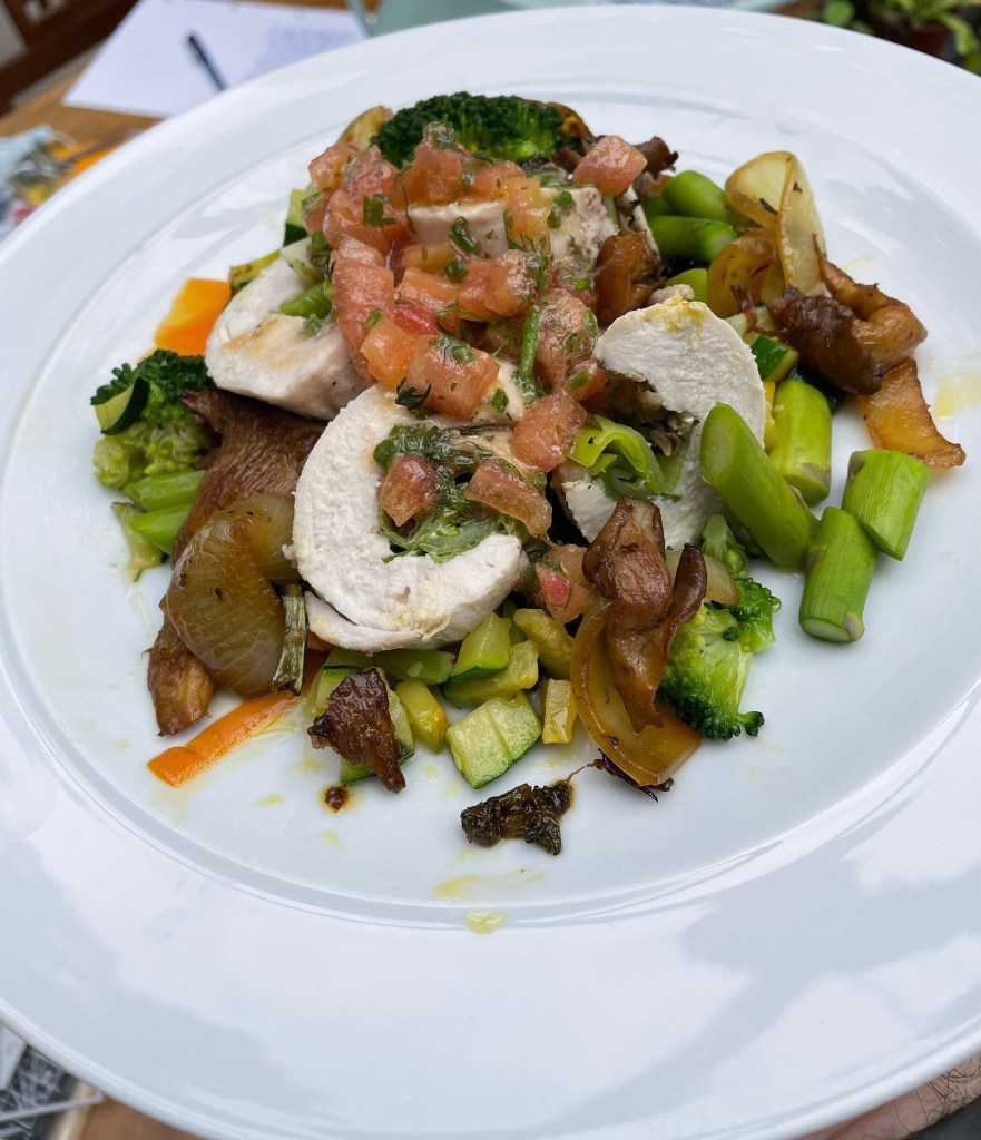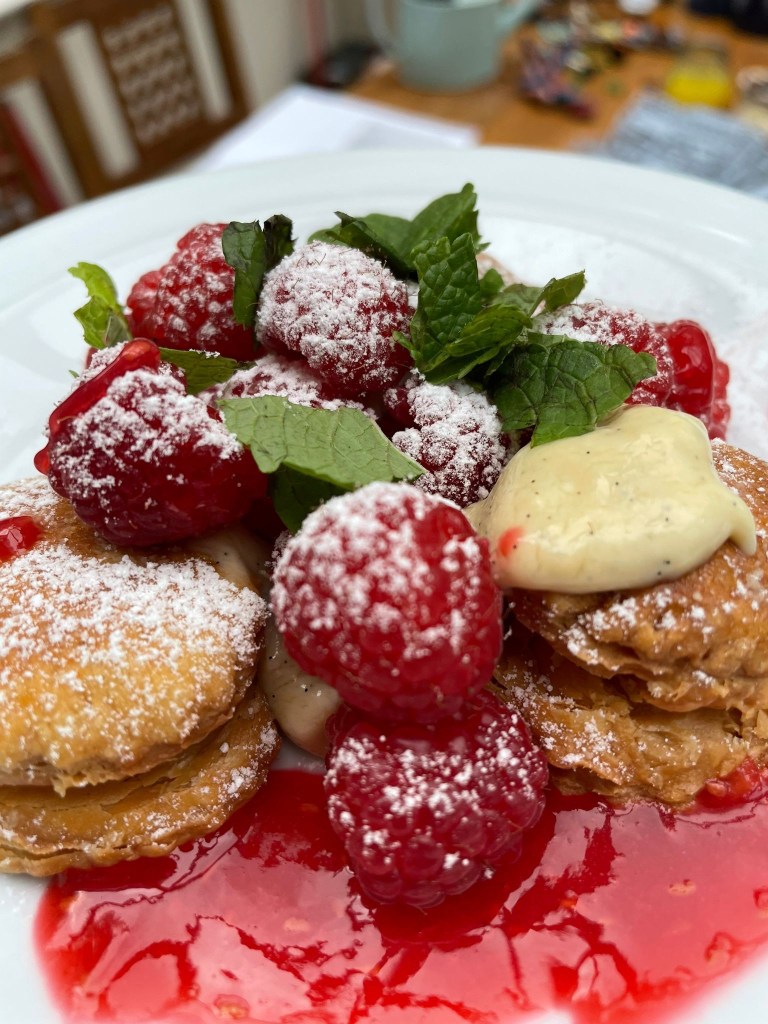 This week’s book was: Off Duty, by David Nicholls. This is a compilation of recipes from different chefs of what they cook at home. We picked chefs that we don’t have other cookbooks of theirs. Sunday was the very light and wonderful Poached Chicken Breasts with Baby Leeks and Trompette Mushrooms, Tomato Dressing and Market Veg followed by Raspberries in Puff Pastry from Anton Mosiman. Whilst this sounds pretty chaffy, the techniques and approach were really straight forward and made for a memorable Sunday Lunch. The puff pastry rose more than the recipe suggested it would so we’ll have to think again on how to make that bit work better but the flavours of the main and desert were great.