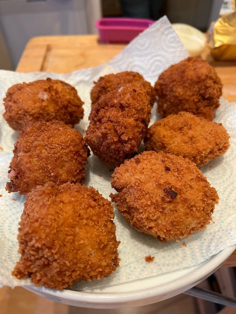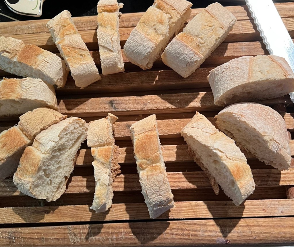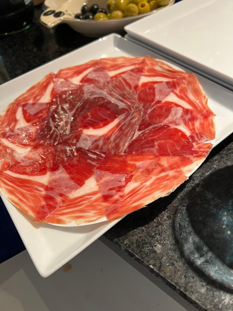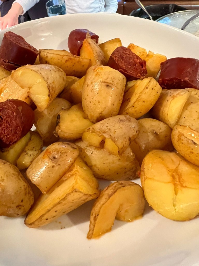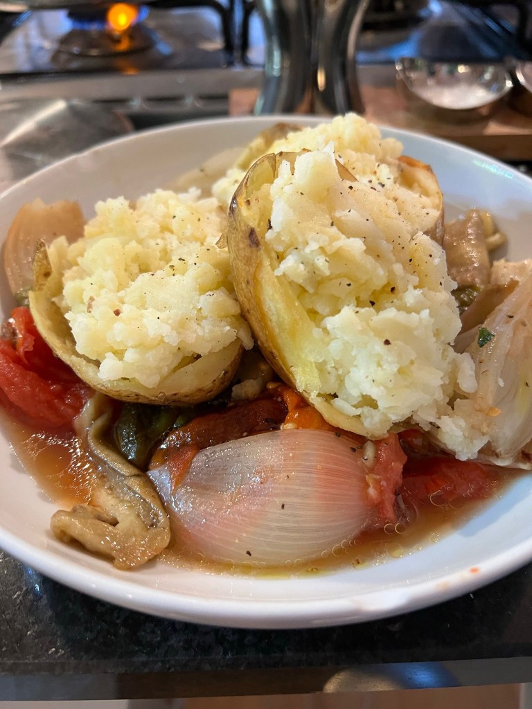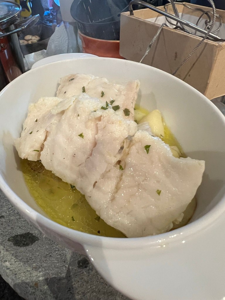 This week’s book was: The Book of Tapas by Simone and Ines Ortega, and Jose Andres. It pretty much does what it says on the tin and has every kind of tapas you can imagine. Sunday lunch was a tapas feast. We started with Jamon Iberico, olives and bread. Next up were ham croquettes, garlic shrimp (gambas aijo), then hake in green sauce, tortilla, Roasted Mixed Vegetables, Potatoes with Chorizo, Pork Skewers – this was a Sam and Sam Clark recipe (of Morro fame). Lunch finished up with Rice Pudding – a recipe by Jose Pizarro (of Brindisa fame). All washed down with Manzanilla sherry, San Miguel and a fine Rioja from the Wine Society. This was a lot of work, but we set up our breakfast area as a tapas bar, so the family sat on that side, and I produced most of the recipes from the kitchen. Mrs B did some fine work on the barbecue for the pork skewers. All the dishes were good, with the croquettes, garlic shrimp, and tortilla being excellent.