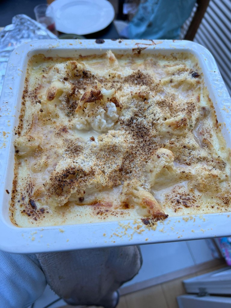 We had a lovely rib of beef with the Yorkshire puddings – always our favourite roast cut, accompanied by Brian’s Cauliflower Cheese. We make Cauliflower Cheese pretty regularly in our house, but Brian’s recipe uses Lancashire cheese rather than Cheddar, which we usually go for. I have to say that Lancashire cheese made a huge difference. The cheese has a tartness that complements a cheese sauce’s richness perfectly. Alongside, we served carrots and broccoli.