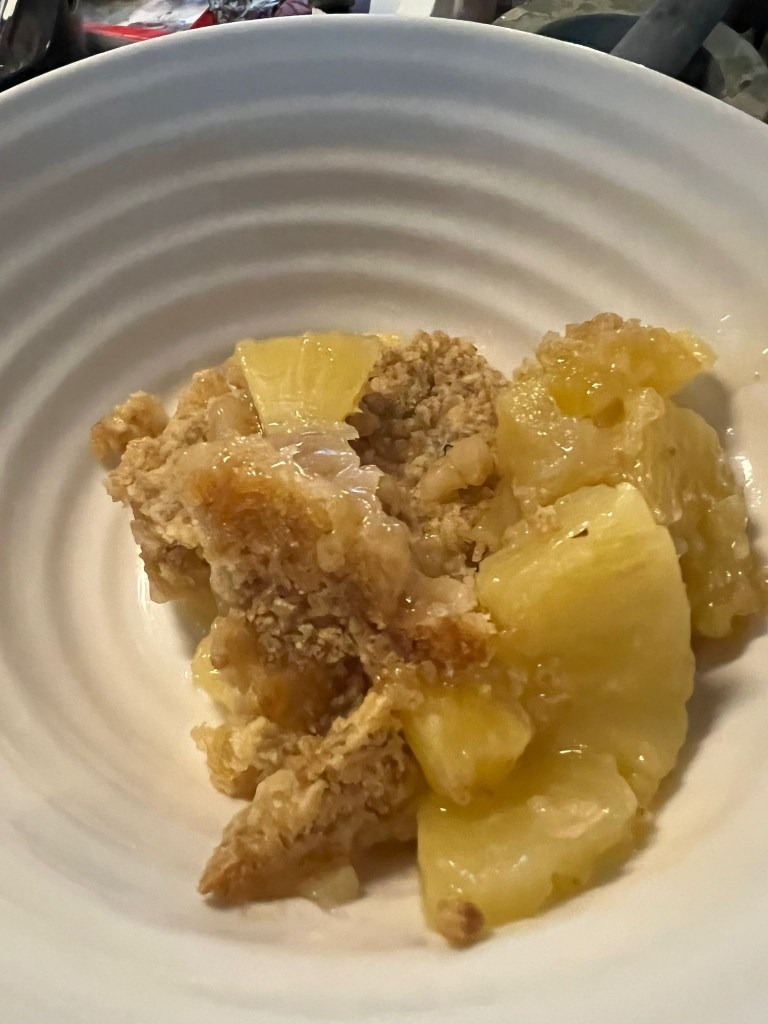 Desert was Brian’s Apple and Pineapple Crumble. We did a pineapple crumble a couple of weeks ago, and I have to say the combo of apple and pineapple is fantastic. Brian’s crumble topping – we’ve had better, but apple and pineapple are winners.