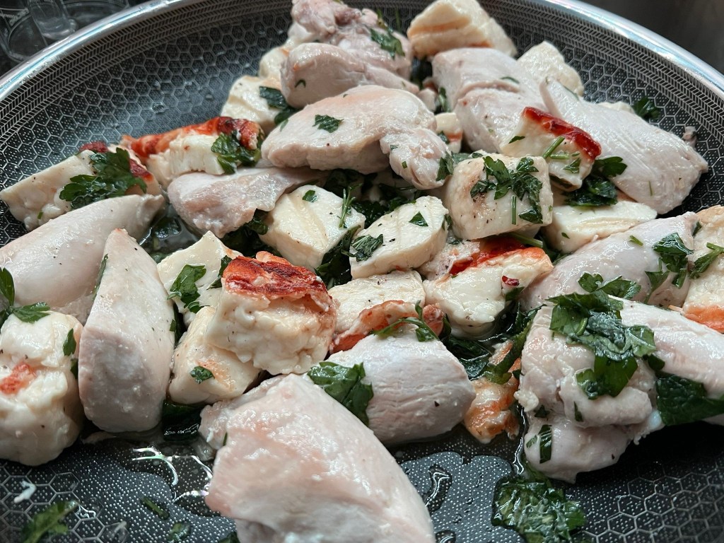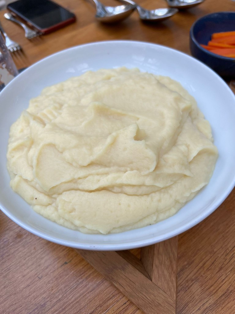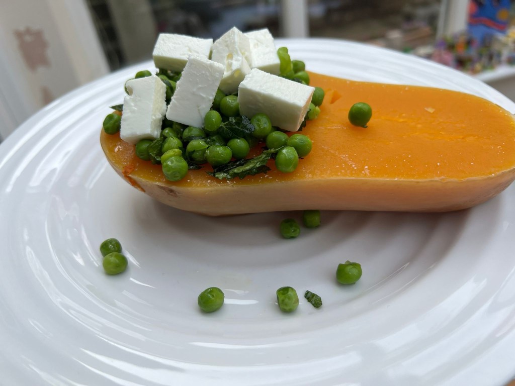 Next up was Grilled Salmon and Baked Onions – another lovely little supper dish. I think the onions could have roasted a touch longer to be sweeter, but it was a nice idea of onions and cream and cheese. For lunch one day, we did Baked Acorn Squash which we used butternut squash. It was tasty – I think it would be even better had we just roasted the squash rather than the way Miss Dahl cooks in a roasting tin in a couple of cm of water. Next up were Chicken and Halloumi Kebabs, a hit for parents and children alike. We did Buttermilk Chicken with Sweet Smashed Potatoes to round off the week. This was a cracking recipe with tender chicken and gorgeous potatoes. The buttermilk tenderises the chicken, which is then pan-fried. It makes for a healthy fried chicken fix without the deep-fried secret recipe.