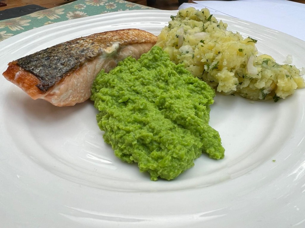 Fillet of Salmon with Crushed potatoes and Pea Puree.
