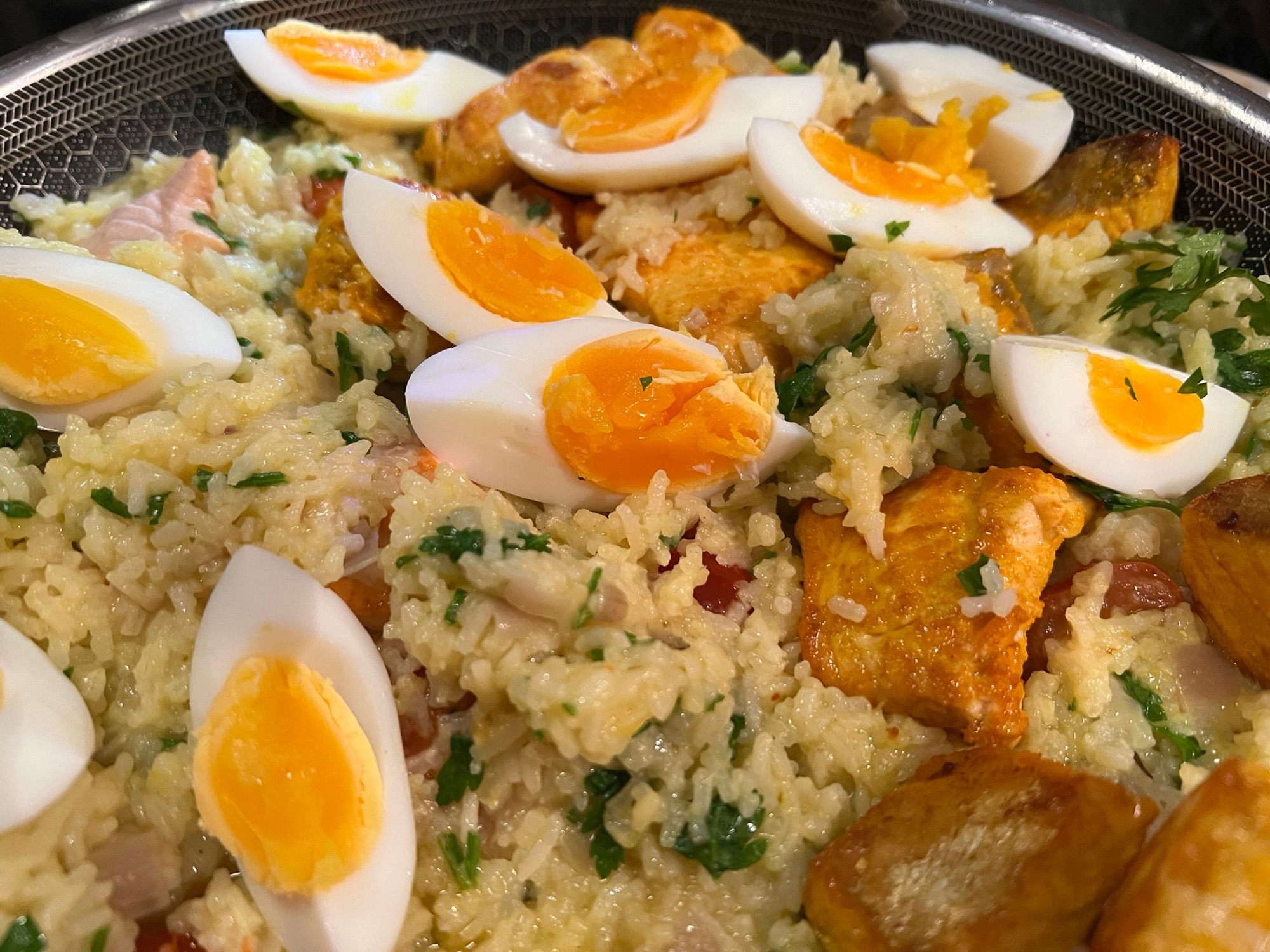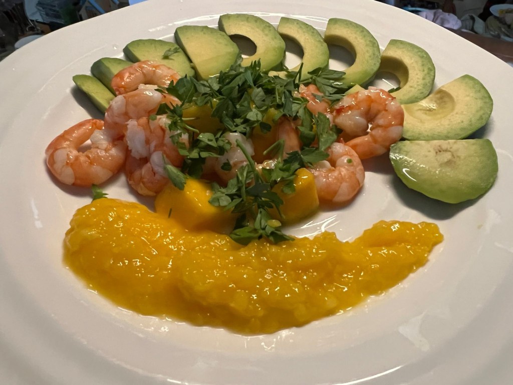 We were back with Gordon Ramsay this week, using his book Gordon Ramsay Makes it Easy. This book we’ve had for years, but it’s never been one we’ve used a lot. That said, the recipes we tried this week were brilliant, and some of them, I suspect, will become stalwarts of our kitchen. We’d had a reasonably heavy weekend of food over the Queens platinum Jubilee weekend, so we needed something a little lighter on Sunday evening, it has to be said. Gordon’s Tiger Prawn Salad with Mango and Avocado was perfect. Just a wonderfully simple Sunday evening meal. Next up was the somewhat unusual Salmon Kedgeree, which was a nice change from our usual recipe – a Michel Roux Jnr one. Gordon’s take on Kedgeree was quite gently spiced with Turmeric and Saffron, but the overall effect was delicious. We left the Salmon in big chunks, which worked pretty well. Now to a great little recipe – a kind of “healthy” fish and chips – Roasted Cod and Tomatoes with Oven Chips. The oven chips were a revelation, and I’m pretty sure I won’t be buying oven chips as often – as these were easy to do and tasted way better. This was a lovely way of having fish mid-week. Next, we moved from fish to fowl in the shape of Oven-Roast Duck Breast with Caramelised Swede. Though I overcooked the duck a touch, the swede was fantastic, and something that I think will be a way of doing swede for us regularly. The combination of the swede with ginger and honey was perfect with the duck and made such an inspired combination rather than a more predictable orange or cherry vibe. Finally, we tried Pork Fillet in Prosciutto with Baked Couscous. This was a fantastic recipe. What was most interesting was the combination of Parmesan and Couscous – it was wonderful. All in all Gordon Ramsey Makes it Easy does exactly what it says on the tin! Next week is busy, so I think we’ll probably do just one or two recipes from our next book: Jamie Oliver’s Return of the Naked Chef.