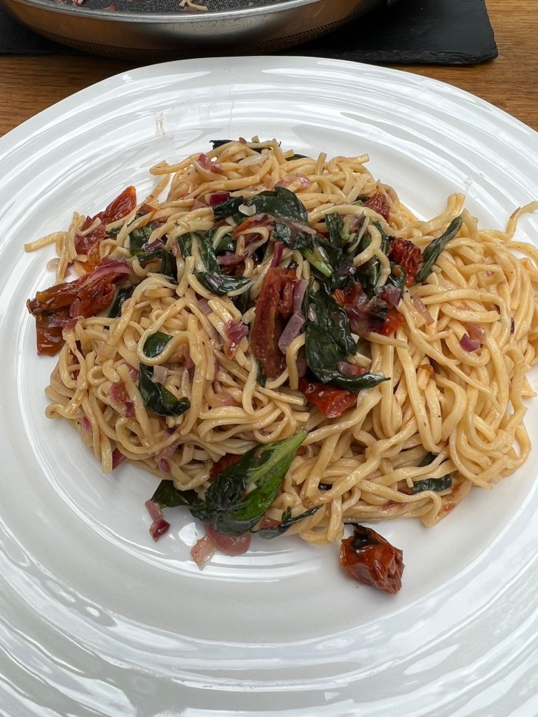 We cooked the great Spaghetti with red Onions, sun-dried tomatoes, balsamic vinegar and basil. Jamie uses dried pasta, but we made our own spaghetti. This really was a cracking recipe which we’ve done subsequently. Think sweet onions, balsamic vinegar sharpness, tomato richness, and the fresh basil to give a lovely little last-minute pasta supper dish. Awesome. Next up was another super simple dish – Tray-baked pork chops with herby potatoes, parsnips, pears, and minted bread sauce. This made a really great change for Sunday lunch. The pears giving a little sweetness, all crooked in a single tray and were dead easy, and the minted bread sauce cut through the fatty pork. The final awesome dish was Peter’s, Lamb Curry. This was a brilliant lamb curry, and though a tough heavy on the lime, it was delicious. Thanks, Jamie your return was fab.