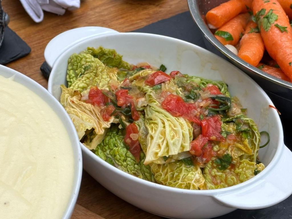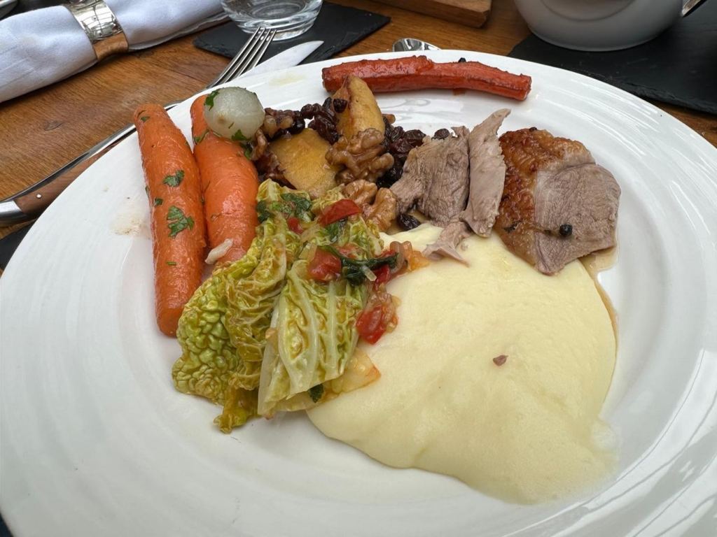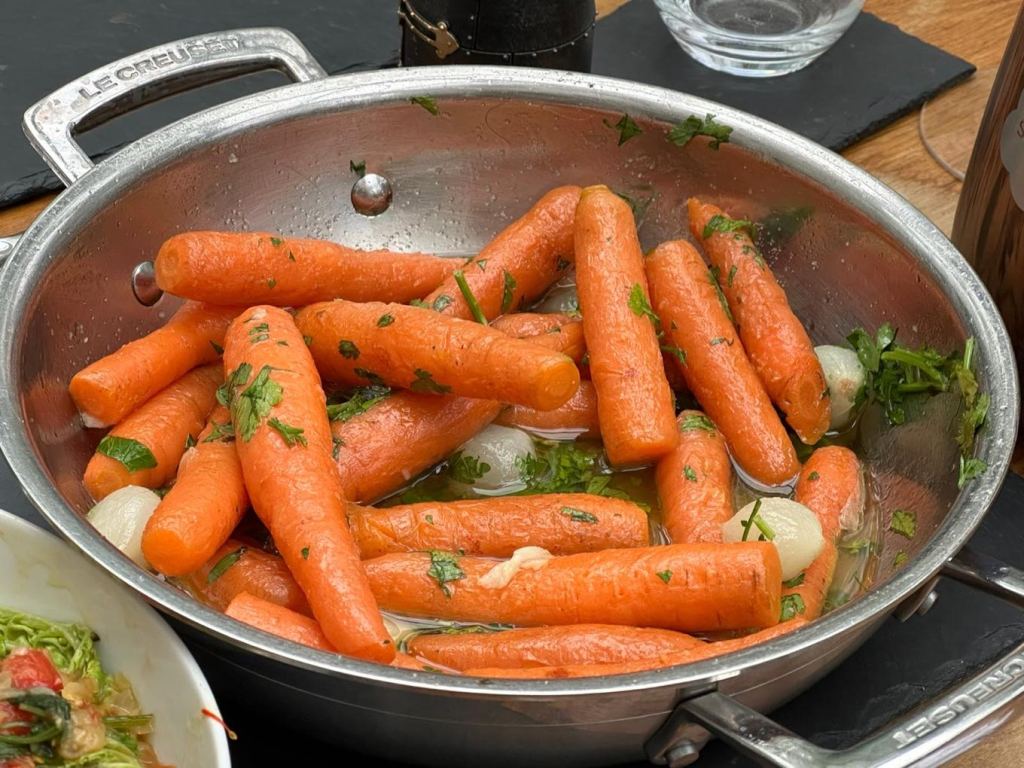 This week we’re in France with one of the bibles of French cooking. The Complete Robuchon, by Joel Robuchon. Sunday lunch was a bit of a Robuchon fest. We cooked Roast Duck with Spiced Honey, Cabbage with Melted Tomatoes and Saffron, New Carrots for Roast Chicken, and Mashed Potatoes. Whilst I’d probably been a touch overzealous with the number of dishes, they were all excellent. Spiced honey for the duck used Juniper, coffee, yes, coffee! And aromatics such as cinnamon and star anise. The duck was delicious, and it was the first time we’d tried a frozen duck – it was fantastic. The cabbage with tomatoes and saffron was an absolute winner. Carrots for roast chicken were simple and really tasty. Joel’s mash should come with a health warning. We used half the amount of butter he uses and even then, they were rich like pommes purée in the best restaurants. All in all the dishes were wonderful and ones to go back to.
