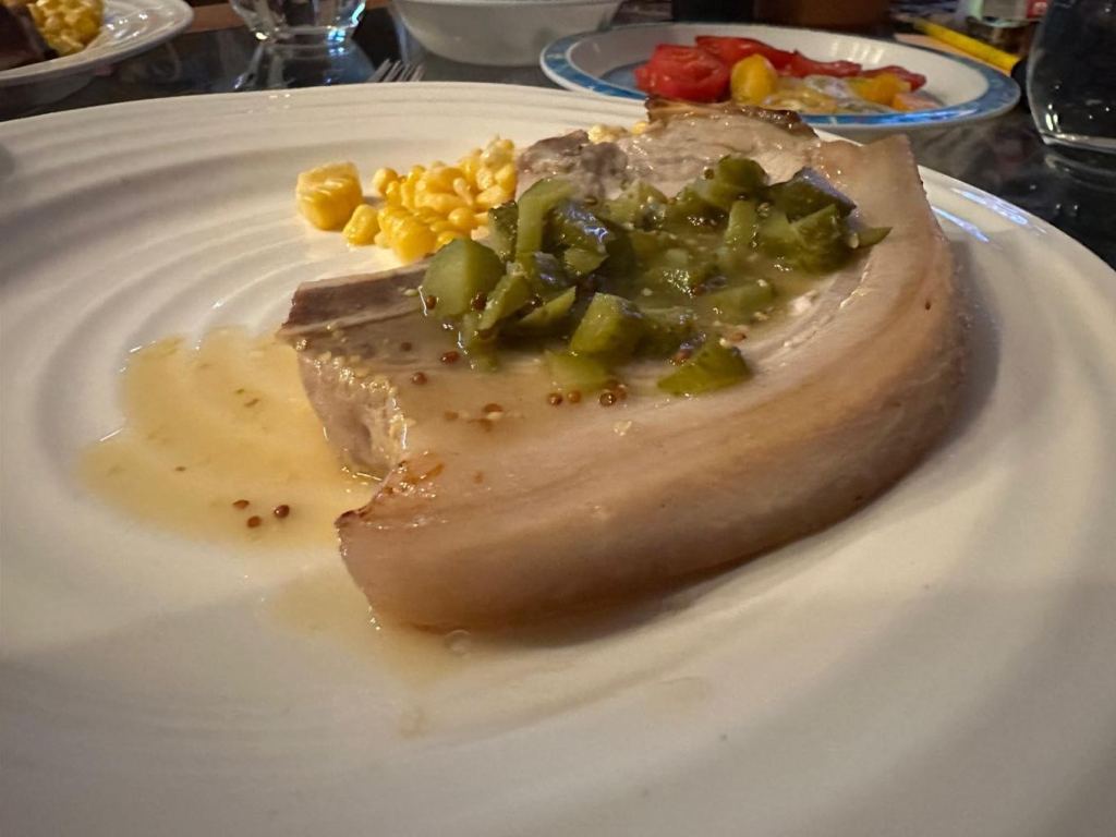 Next up was Pork Chops with Cornichons. Simple pork chops pan fried with a sauce made from the pan juices, white wine, mustard, stock and cornichons. The sweet tart cornichons complimented the fatty pork perfectly. It’s definitely a great little sauce to have in the pocket for pork dishes.