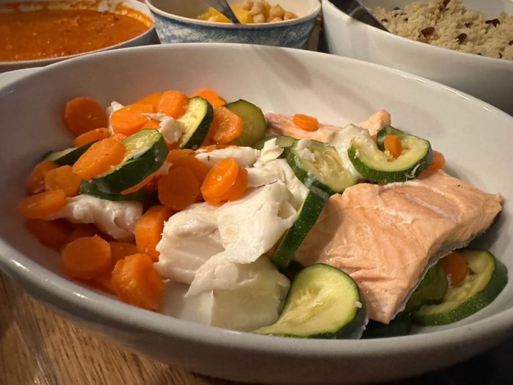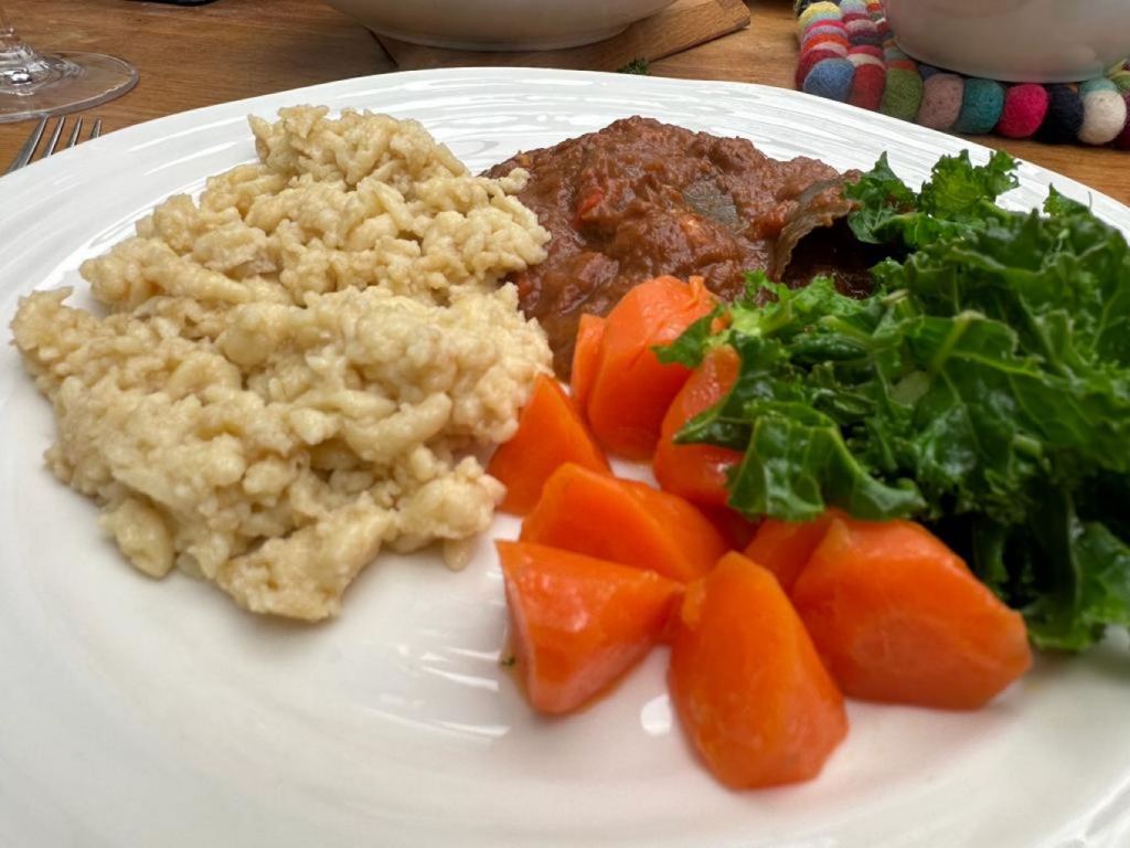 We’ve had the joy of a Thermomix for well over 15 years. Fast and Easy Coooking – Thermomix TM31 Recipe Book by Janie Turner is the book that came with our TM31. We first saw a Thermomix being used by Alan Murchison at the Ludlow food festival years ago. We went to a masterclass of his and later in the day I ended up on stage with him cooking a soufflé in front of a massive crowd. Cooking a soufflé is hard enough, in front of a crowd of a couple of hundred people is tougher, doing it after a few more than ideal pints of cider and craft ale is ill advised, doing it with a chef who is knocking the air out of your mixture and opening the door of the oven is quite terrifying. Suffice it to say everything Alan did had no impact on the soufflé and was all part of the joke. He gave us a book which we’ll cover in a few weeks. The Thermomix is a wonderful piece of kit that you see regularly on Great British Menu and Masterchef. It’s essentially an industrial strength blender that heats up and weighs, times, whips and stirs. It has attachments for steaming as well. When we bought it it was expensive but It is like an extra pair of hands in the kitchen. From the book we cooked French Bread – not bad, the texture and flavour was good. Next up was Hungarian Goulash which we served with Spätzler – we love Spätzler and we’re getting better at making it. The goulash was really good and dead easy. Next up was Fish Couscous – beautifully steamed fish with a fruity, spicy cous cous and veg. This was really light and tasty and actually quite easy for a weekday dinner. Next was Penne with prawns and rocket. Not one for the kids but wow – really really great flavours and dead easy. This recipe would be easy to do without a thermo just a regular blender. Last up was Red Chicken Curry – a pretty good example but not one I think we’ll rush back for. We’re Thermomixing again next time.