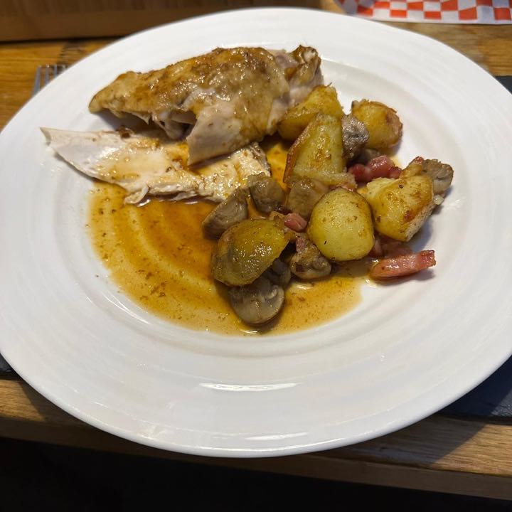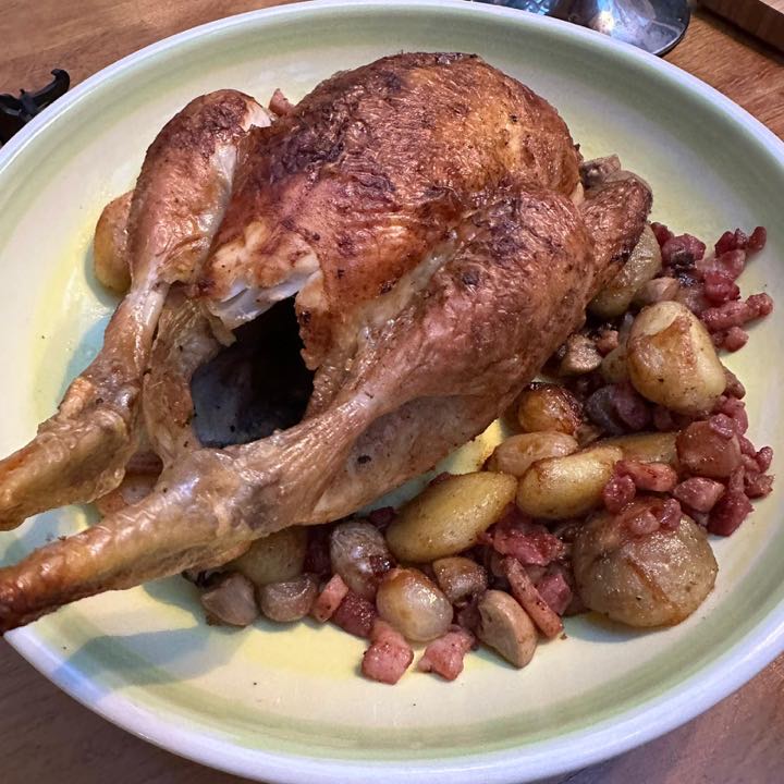 Next up was Poulet Roti Grand-mère (Grand Mother’s Roast Chicken). A classic roast chicken with pearl onions, lardons, mushrooms and a gravy made from the juices. I turned the potatoes – I need loads more practice to get better at this. It was a great roast chicken.