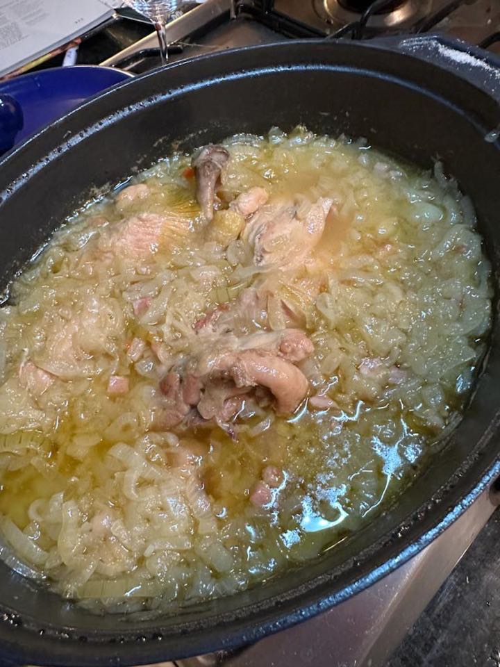 This week we cooked from the cookbook of a restaurant that is something of a Bordeaux institution. The restaurant is La Tupiña. It was featured in an episode of Rick Stein’s French Odyssey. My brother and dad went there together and raved about this amazing little restaurant famous for its chips, cooked in the Tupina (a kind of metal cauldron) in duck fat over the open fire. They had cote de beouf and these amazing chips. We went and paid a visit a few years later, La Tupiña did not dissapoint. The book is full of beautiful picutres of the restaruant and the area around bordeaux and the town. The book, is is in french so to cook the dish we had to lean in on our french and a little help from Google Translate. We cooked Le Poulet à L’onion D’yves Harté. Essentially this is a chicken cooked on top of about a kilo of onions with some stock and white wine, some thyme and not a lot else to it. The recipe says it’s ready when the smell of onions fills the house. What a magical description. This recipe was so simple and produced one of the best chickens we’ve eaten of late.